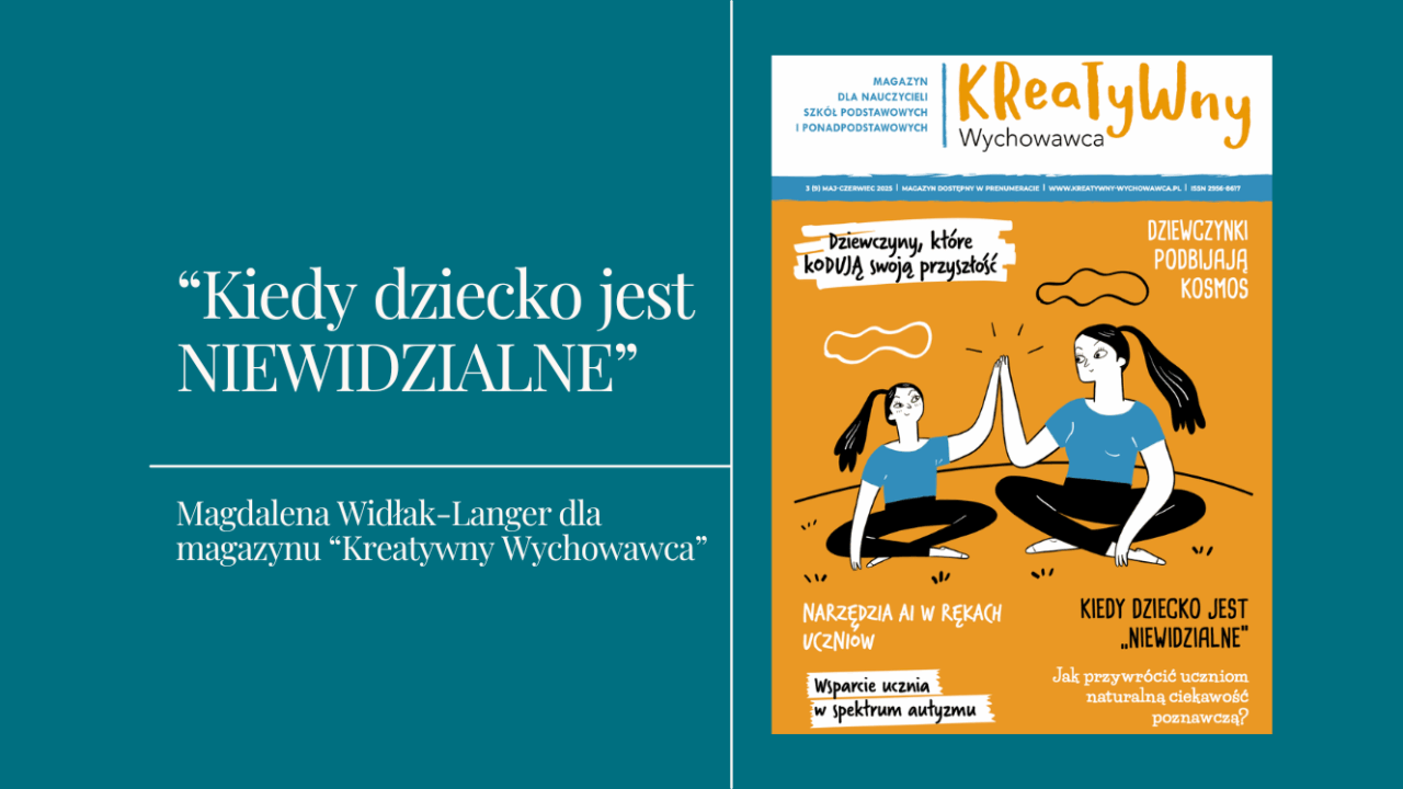 W artykule mojego autorstwa, opublikowanym w najnowszym numerze magazynu Kreatywny Wychowawca. (maj-czerwiec 2025) przyglądam się zjawisku emocjonalnego wycofania – mechanizmowi, który może być reakcją na lęk, napięcie, przemoc – domową, rówieśniczą lub seksualną – brak poczucia bezpieczeństwa. Znikanie to nie tylko metafora – to codzienna rzeczywistość wielu dzieci.