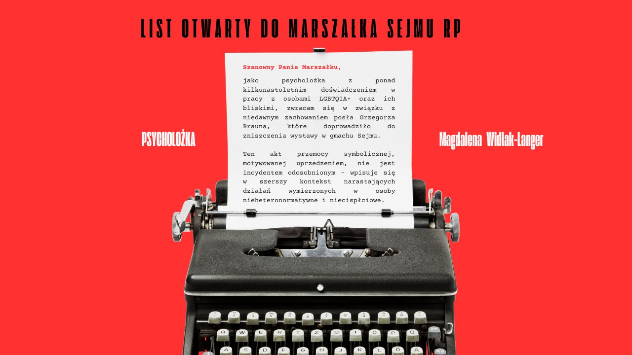 jako psycholożka z ponad kilkunastoletnim doświadczeniem w pracy z osobami LGBTQIA+ oraz ich bliskimi, zwracam się w związku z niedawnym zachowaniem posła Grzegorza Brauna, które doprowadziło do zniszczenia wystawy w gmachu Sejmu. Ten akt przemocy symbolicznej, motywowanej uprzedzeniem, nie jest incydentem odosobnionym – wpisuje się w szerszy kontekst narastających działań wymierzonych w osoby nieheteronormatywne i niecispłciowe.